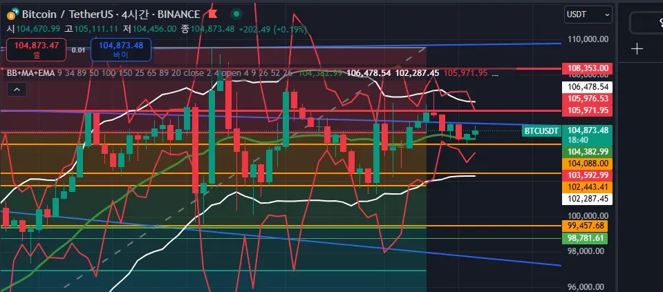 강의대로 지지 저항 작도 후 104,974 에 진입 후, 볼린저밴드 저항 확인 후 106,213에 매도 해봤습니다.