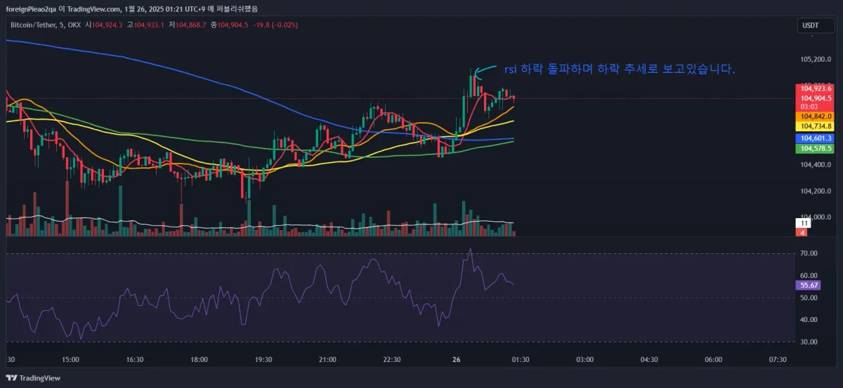 rsi 70아래로 하향 돌파. 일시적 하락 후 다시 올라가는 모습입니다.