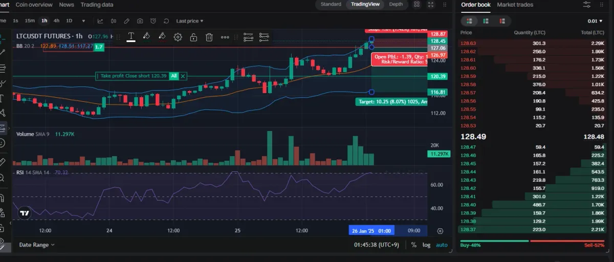 1. 볼린저 밴드와 RSI 지표상으로는 가격이 내려올 것으로 예상됩니다.