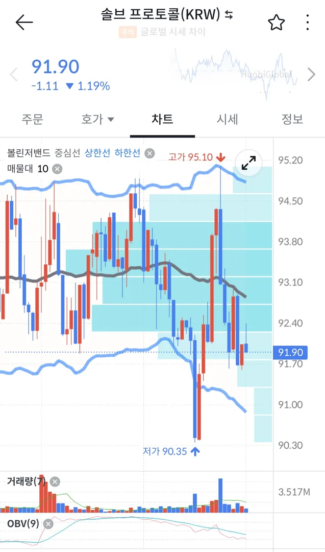 손절가는 볼린저밴드 하단에 닿는 91로 정하고