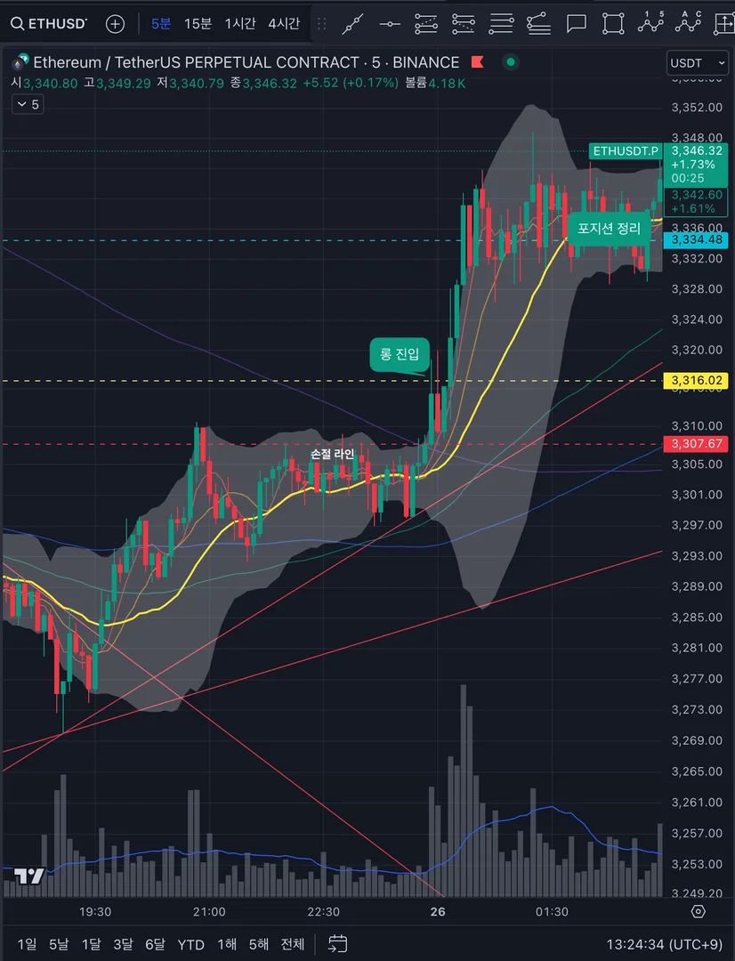 - 1분봉 상승 추세에서 저점을 계속 높이다가 낮춤
