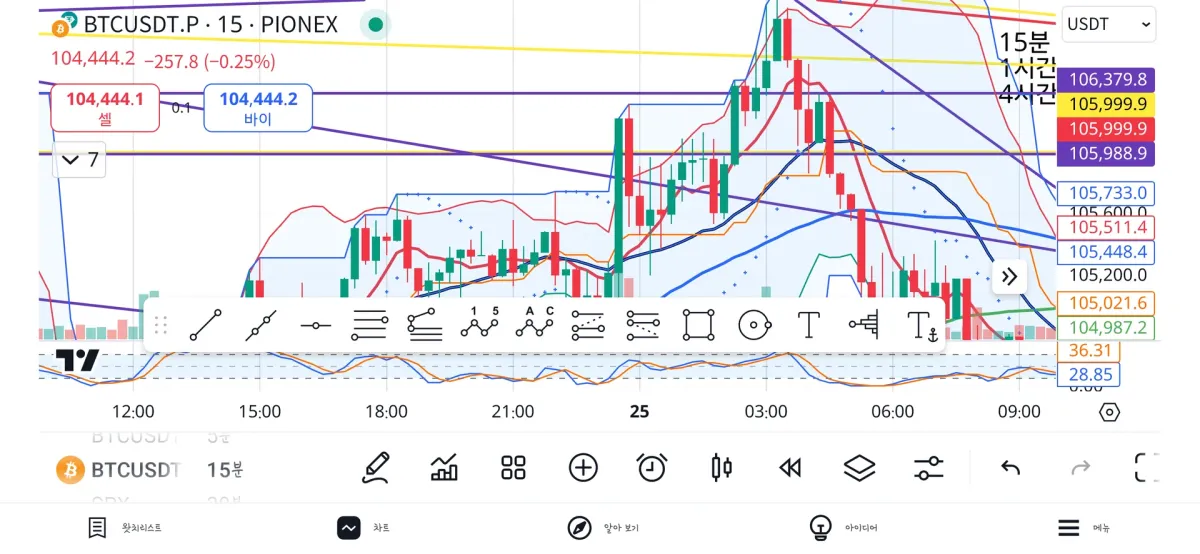 아직 지표는 볼린저밴드만 볼 줄 안다고 판단하여 볼린저밴드 중단과 지지선에 지지 받는 타이밍에 진입하였습니다. 확신이 없었지만, 다행히 볼린저 밴드 상단을 닿아주면서 수익실현하였습니다.