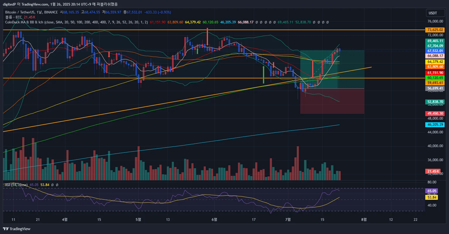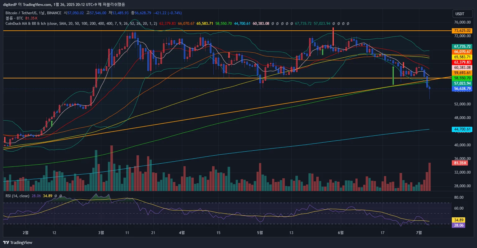 횡보구간에서 RSI 30이하, 볼린저밴드 하단 이탈에 추가적으로 거래량이 터지면서 지정해두었던 추세선의 하방 지지선을 이탈하여서 롱포지션으로 진입하였습니다.