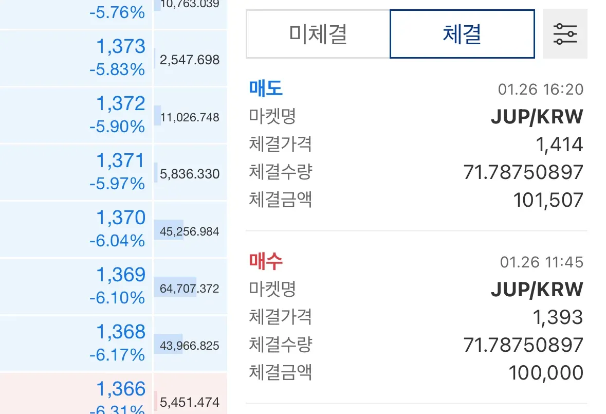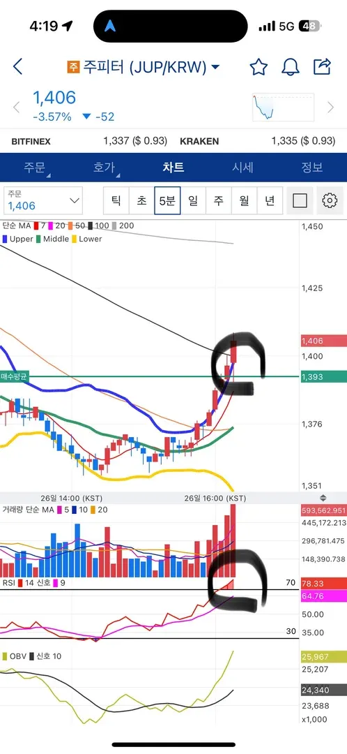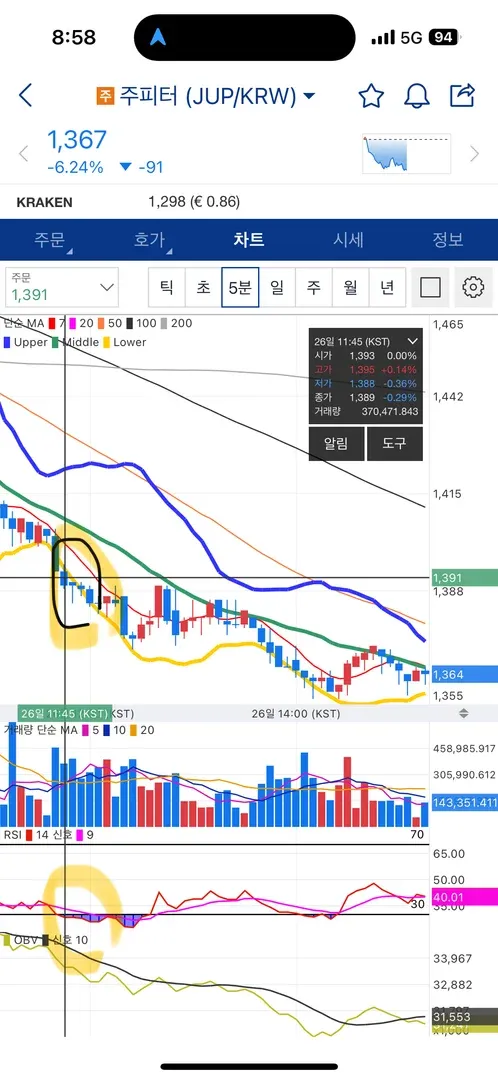 차설 강사님의 강의를 듣고 볼린저밴드 + RSI 를 통해 소액으로 매매를 진행해보았습니다. 볼린저밴드 하단에 과매도부분이라 매수를 하였고 이후 볼린저밴드 상단을 뚫고 RSI도 과매수길래 매도해보았습니다 정말 소액이긴하지만 !! 아직 선물은 어려워 현물로 도전해봤는데 신기합니다.. 다만 추세 후 횡보 구간에서 진행해야했는데 급한 맘에 전체적으로 보았을땐 하락 추세에서 진행한거 같아서 다음에는 전체적으로 보는 눈을 키워야될것같습니다.