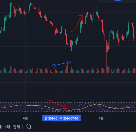 거래량이 올라가고 RSI는 떨어지니 가격이 상승하였다.