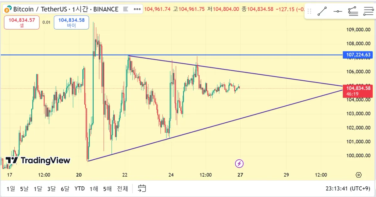 그랬더니 삼각수렴안에 들어서 크게 벗어나지 않으면 매수를 진행할거 같습니다.