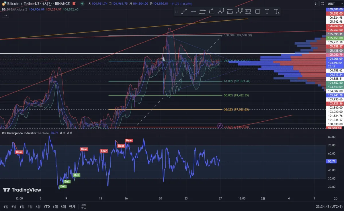 5분봉기준 피보나치 78%선에 저항작용하고 있는 것을 보아 박스권안에 횡보하고 있는 모습.