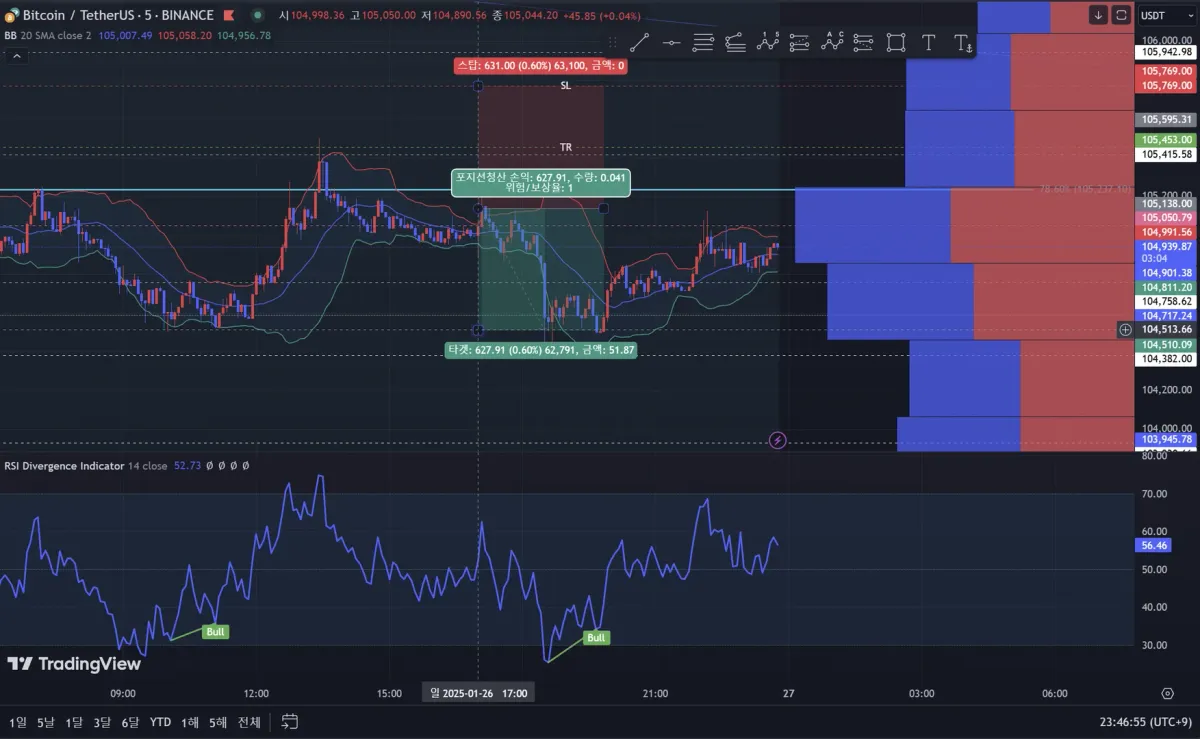 롱포지션을 잡을때 1분봉기준 상승세가 약해지고, 다이버전스가 보임으로 14%의 수익률로 포지션 정산 하였습니다.
