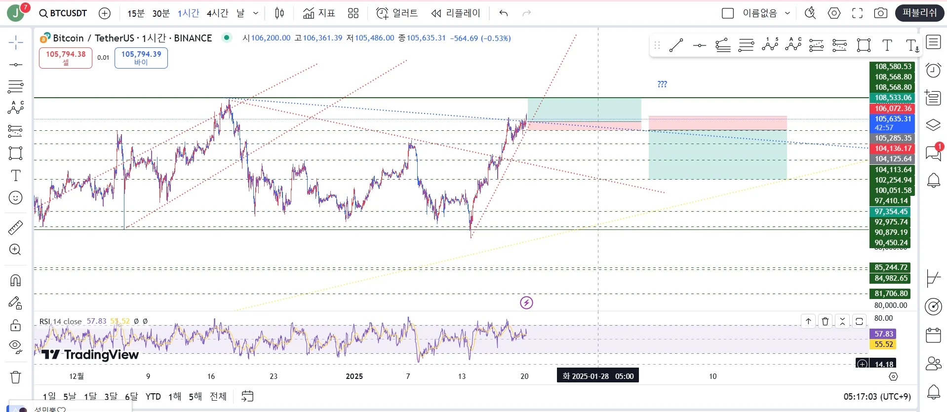 지지 저항선, 추세선 사용해서 105,635 에 롱 진입