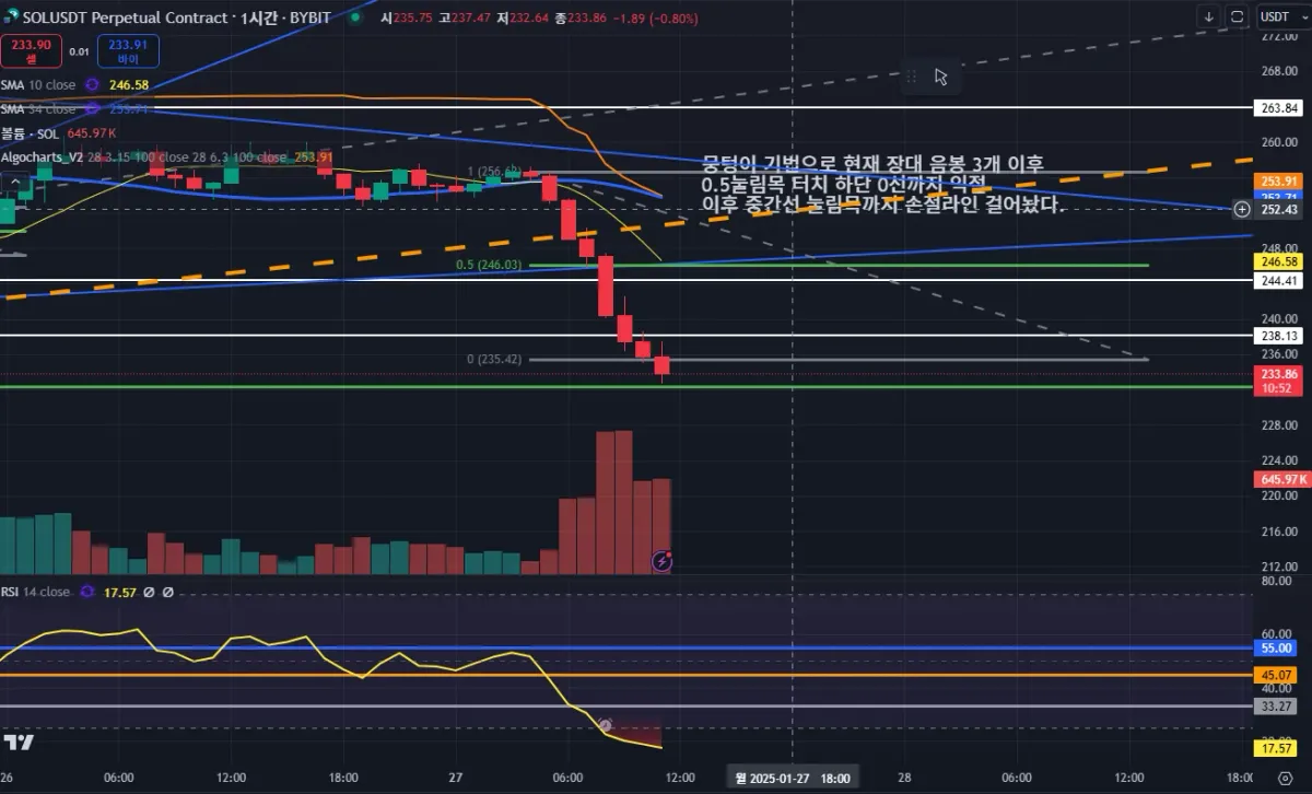 SOL 상승 지지선 뚫고 하락으로 강한 돌파 이후 RSI 과매도 구간 출현 또한 의미있는 지지대 출현 매수 진입