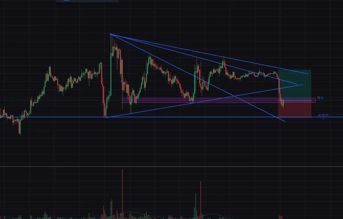 삼각수렴형태에서 밑으로 깨진 형국이라 좀더 보는게 맞는 것 같지만 일단 지지선이라 생각되는 부분에서 들어갔고 손절 라인을 정한후 전고점 부근 수익으로 손익비 1.85정도 되게 세팅했습니다.