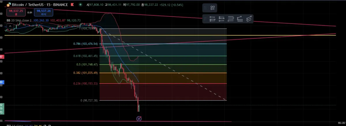 그리고 나서 15분 차트로 바꿔서 현재 시간대에 피보나치를 그려보았는데, 마침 0 언저리로 계속 하락하길래 모의트레이딩 숏으로 진입했습니다.