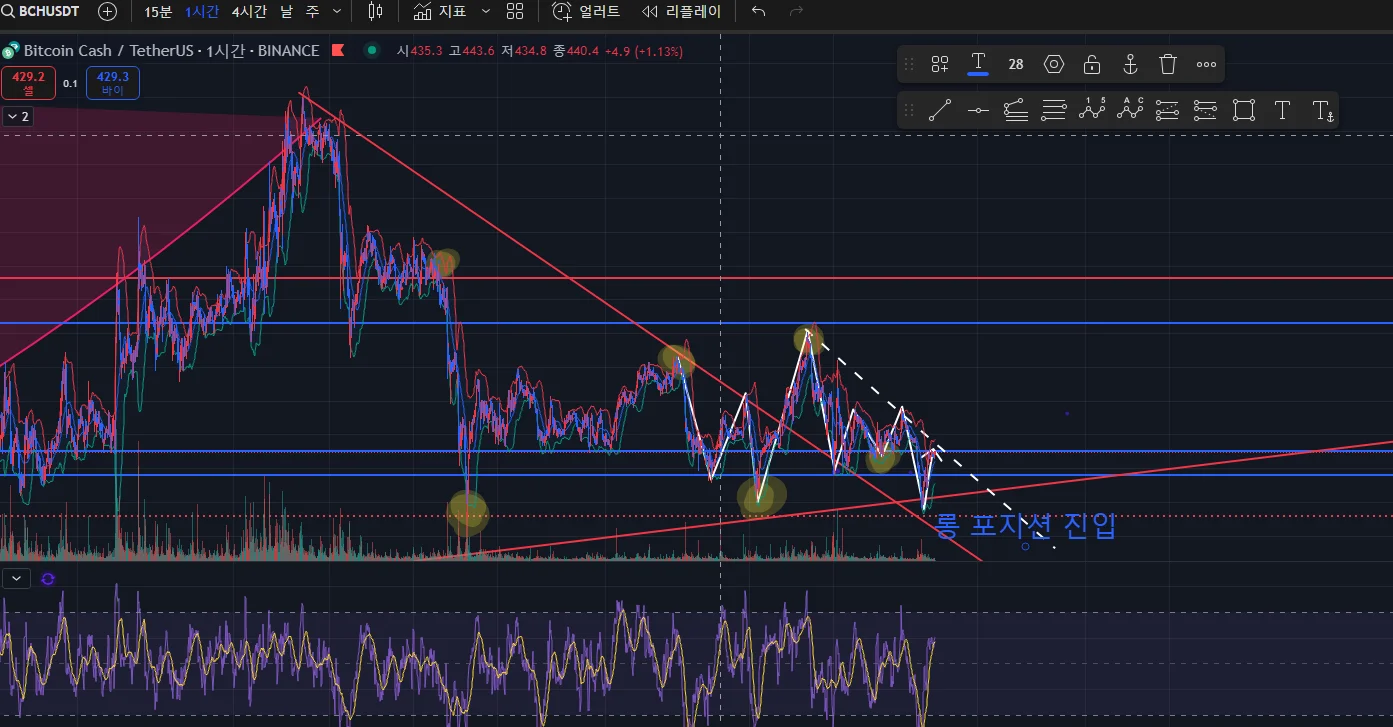 하락을 포착 하고 하단 하락추세선을 이탈하지 않았기 때문에 한번 더 추가 매수를 들어갔습니다.