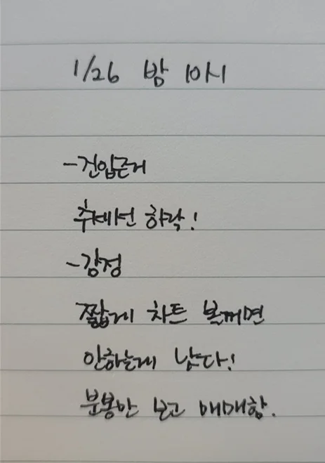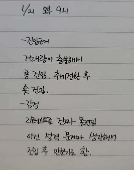 최대한 간결하게 하루의 매매를 복기하는 식으로 메모를 해뒀어요