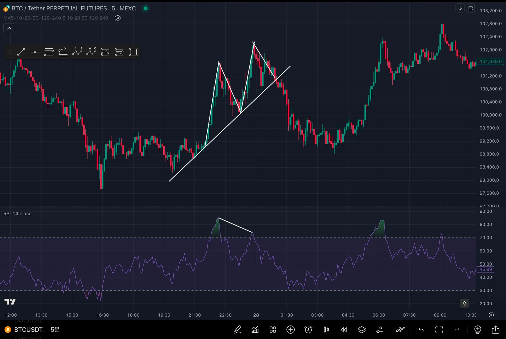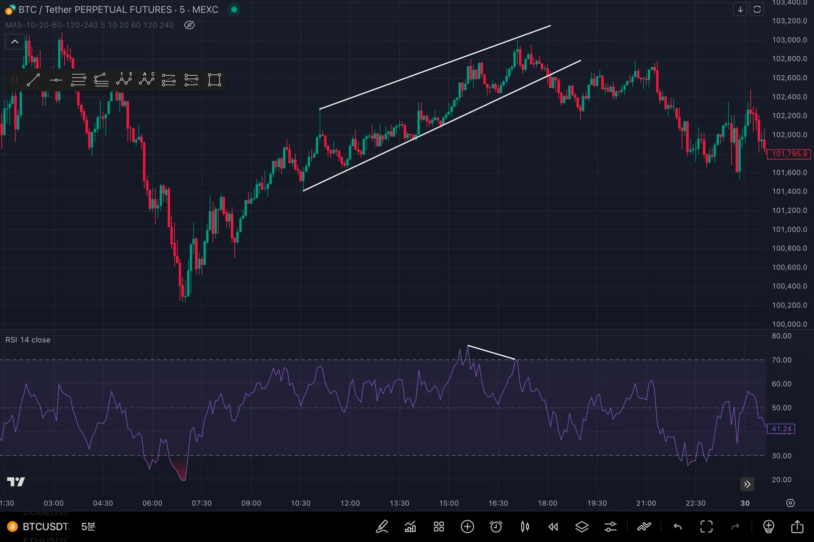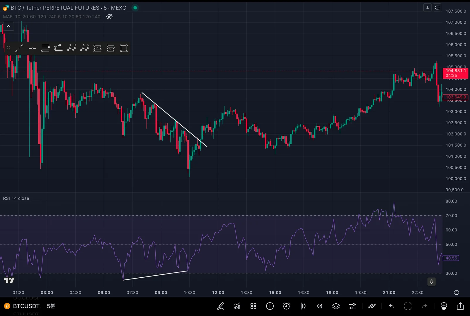 RSI 추가하는 김에 상승, 히릭 다이버전스를 찾는 연습 또한 함께 진행하였습니다. 첫번째 사진은, 하락 다이버전스 및 더블탑 패턴이 함께 나오면서 강한 하락을 예상해볼 수 있었습니다. 두번째 사진은, 하락 다이버전스 및 라이징웻지 패턴이 함께 나오며 약간의 저항을 받다가 하락이 이어졌습니다. 세번째 사진은, 상승 다이버전스를 찾아보았습니다. 마지막 사진은, 상승 다이버전스를 찾았는데 이후 강한 상승을 찾아볼 수 없었는데 상승 다이버전스 이후 나온 약한 반등을 상승 다이버전스로 인한 반등이라고 해석해도될지 여쭙고 싶습니다.