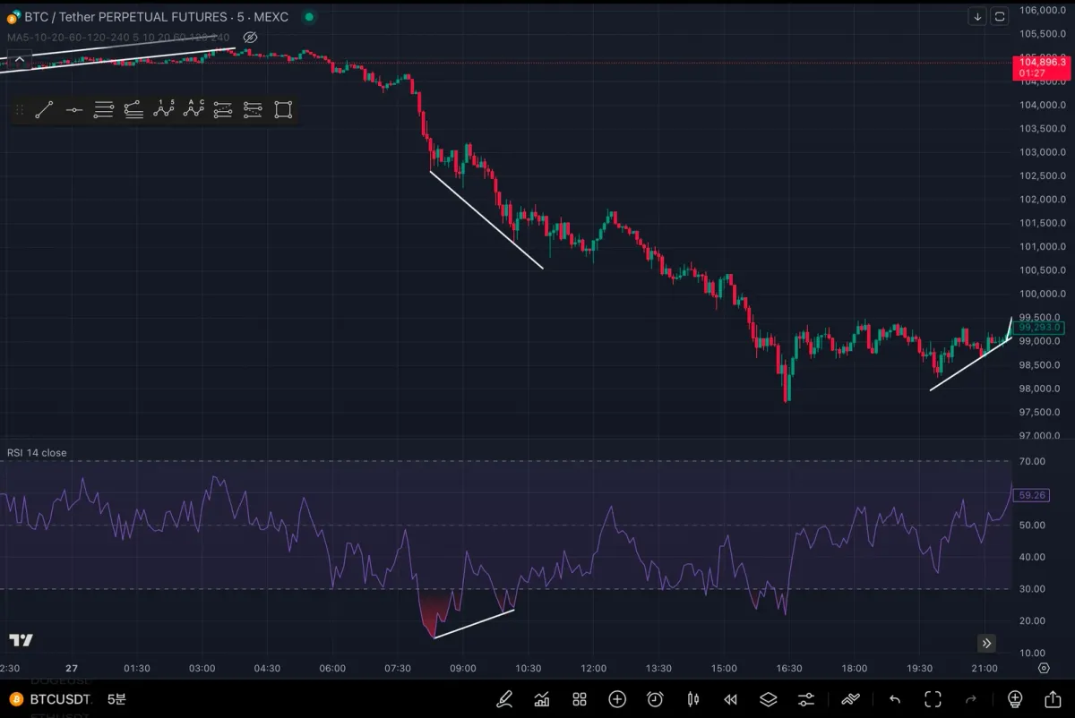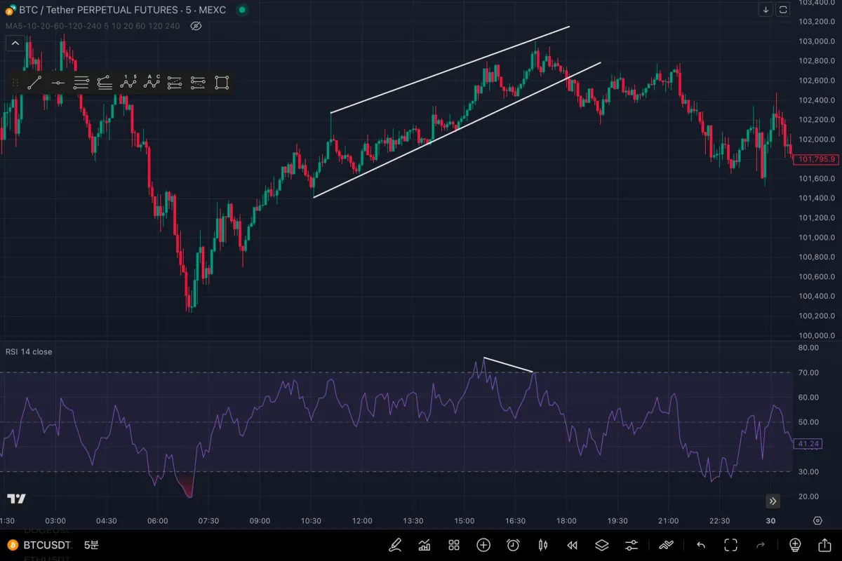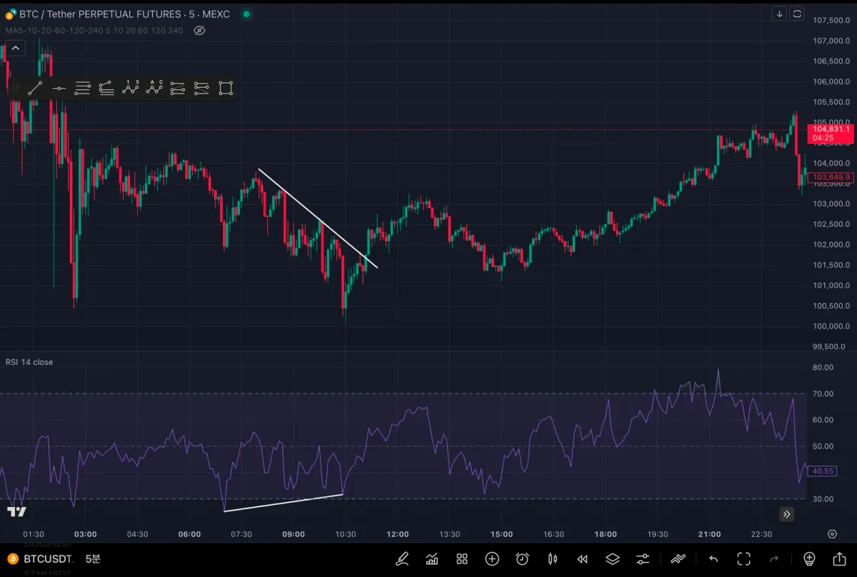 작성자RSI 추가하는 김에 상승, 히릭 다이버전스를 찾는 연습 또한 함께 진행하였습니다. 첫번째 사진은, 하락 다이버전스 및 더블탑 패턴이 함께 나오면서 강한 하락을 예상해볼 수 있었습니다. 두번째 사진은, 하락 다이버전스 및 라이징웻지 패턴이 함께 나오며 약간의 저항을 받다가 하락이 이어졌습니다. 세번째 사진은, 상승 다이버전스를 찾아보았습니다. 마지막 사진은, 상승 다이버전스를 찾았는데 이후 강한 상승을 찾아볼 수 없었는데 상승 다이버전스 이후 나온 약한 반등을 상승 다이버전스로 인한 반등이라고 해석해도될지 여쭙고 싶습니다.