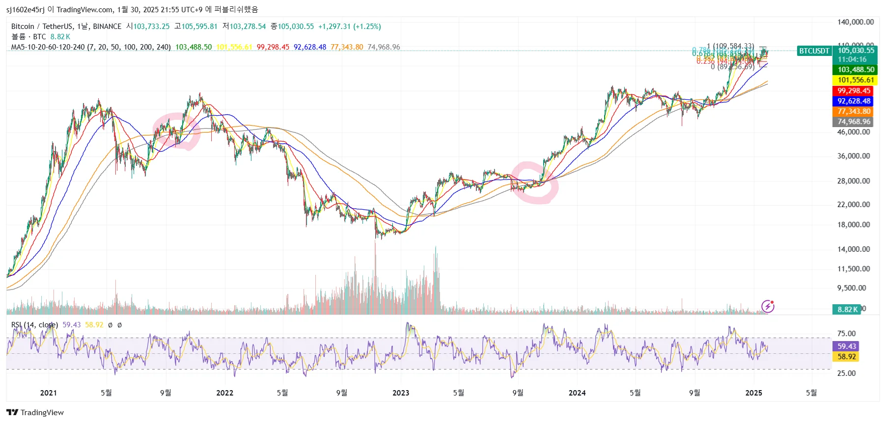 RSI 지표를 추가하고 이동평균선도 추가해서 나름대로 데드크로스와 골든크로스도 찾아보긴 했습니다.