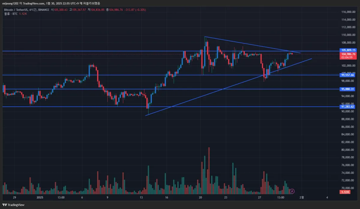 비트코인 4시간 봉 추세선과 지지 저항 작도를 해보았습니다.