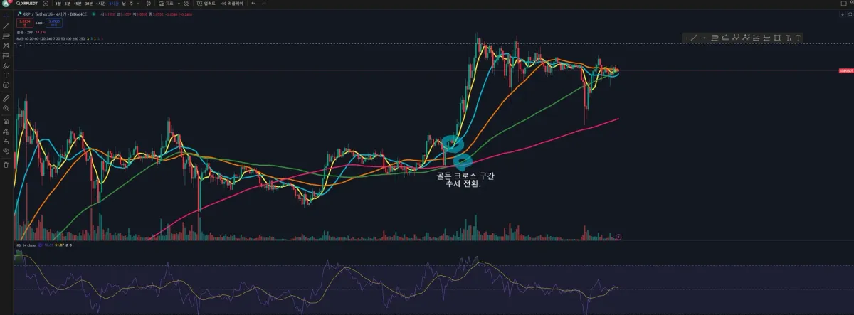 30일 챌린지 12기 2주차 RSI 지표 추가하기 이동평균선 추가. 골든크로스 추세전환. - 7일 챌린지 커뮤니티
