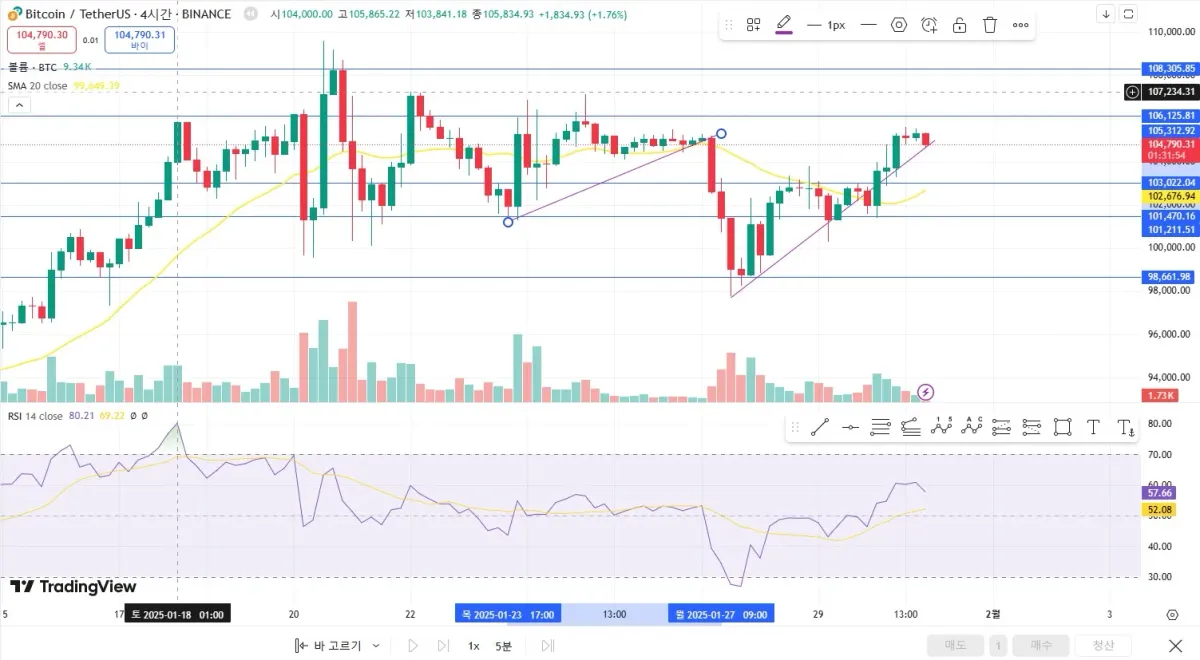 홍스타님 미션 수고하셨습니다! 상승추세선 2개를 그려주신 듯하네요, 수평의 지지 저항선도 추가해보시면 좋을 것 같습니다😊 지지, 저항의 경우 1) 거래량이 많이 나온 캔들의 저점 혹은 고점에 표기해보거나 2) 가격의 저항혹은 지지를 여러번 받은 구역을 체크 해보시면 편하게 체크하실 수 있을 겁니다. 추세선의 경우 1) 하락추세선은 고점과 고점을 연결하여 그리고 2) 상승추세선은 저점과 저점을 연결하여 그리면 쉽게 그릴 수 있습니다. 이 부분을 염두하여 작도해보시면 훨씬 더 명확한 차트 분석을 하실 수 있을겁니다. 남은 미션과 챌린지도 응원하겠습니다!🩵