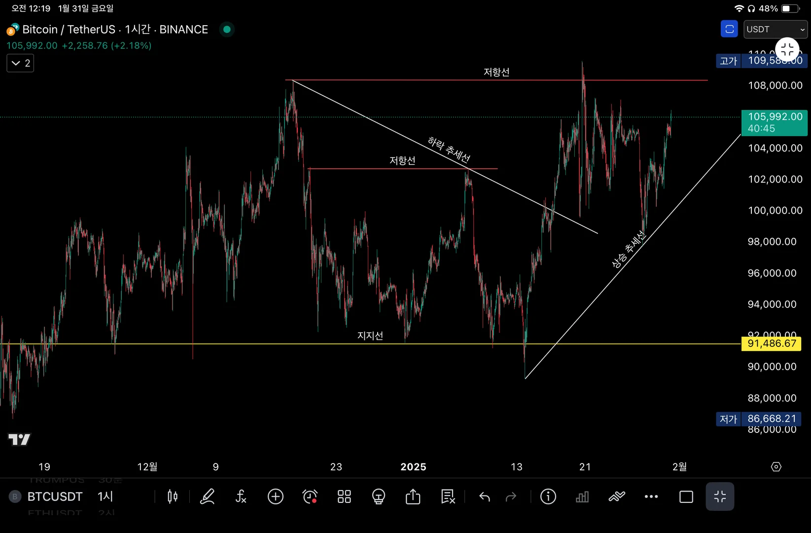 Taedy님, 미션 수고하셨습니다!! 두 개의 저항선과 긴 지지선을 추가해주셨네요 :) 고점과 고점을 연결한 하락 추세선, 저점과 저점을 연결하여 상승추세선도 잘 그려주셨네요👍 남은 미션과 챌린지도 응원하겠습니다!🩵