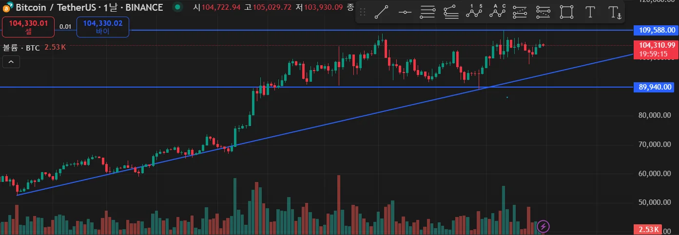 전반적인 상승 추세에서 최근 109,588을 저항선, 89,940을 지지선으로 박스권인 상황이라고 생각하고 작도했습니다.