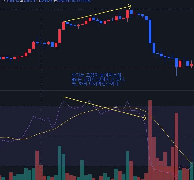 하락 다이버전스는 주가의 고점은 높아지고 RSI의 고점은 낮아지는 것이고
