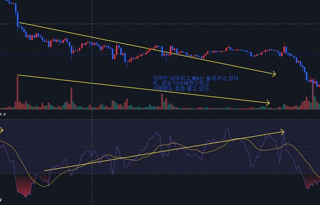 반대로 주가는 낮아지고 RSI는 높아지는 상황에 거래량도 낮아지고 있을때 상승하는 경우를 확인했습니다.