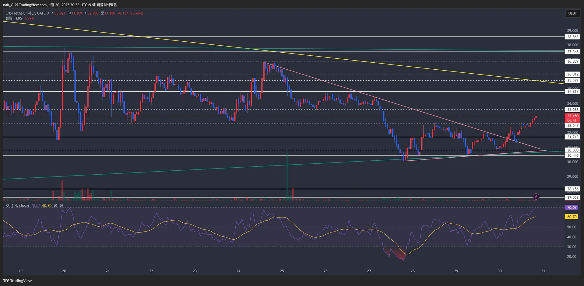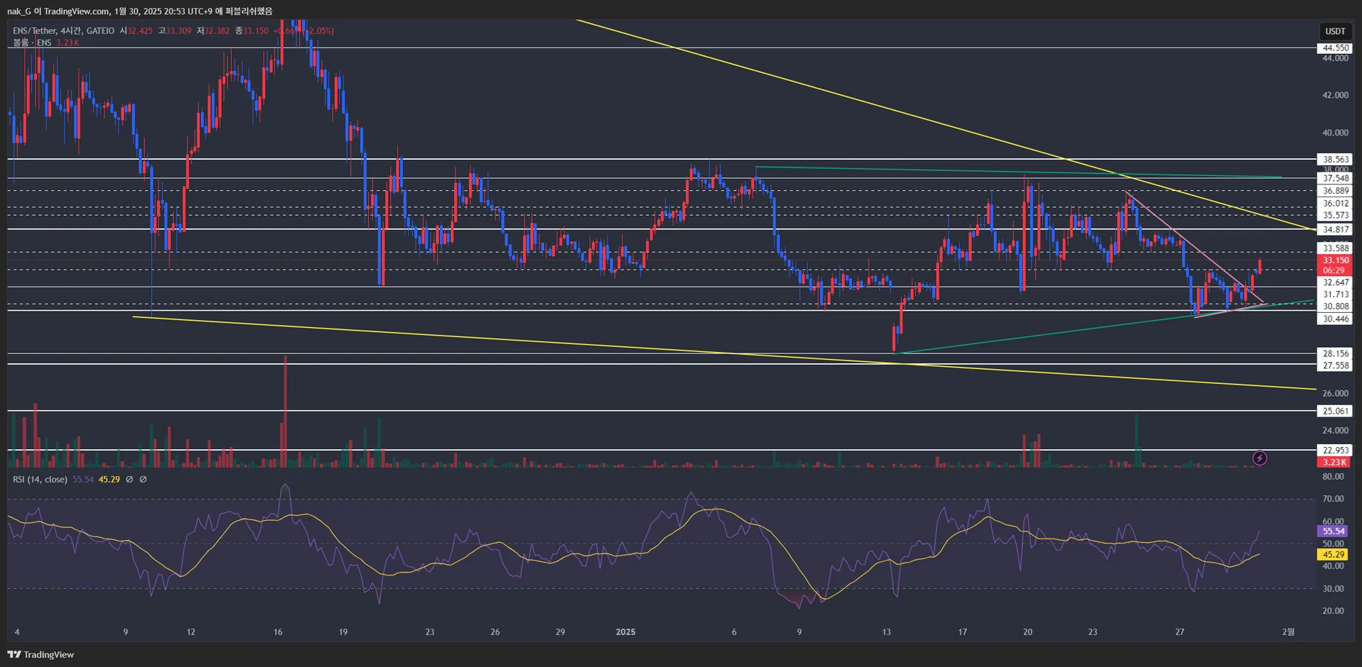 일봉의 추세선이었던 35.5 정도를 목표가로 잡고 피보나치 되돌림을 적용하였을 때 0.236구간을 손절라인으로 적용하였습니다.