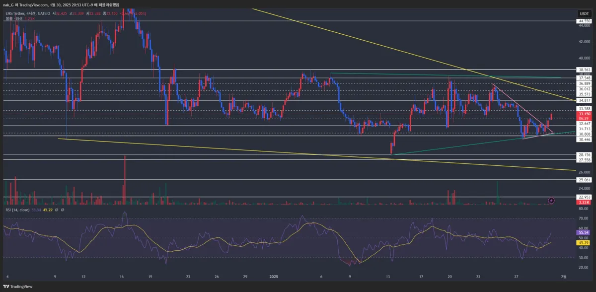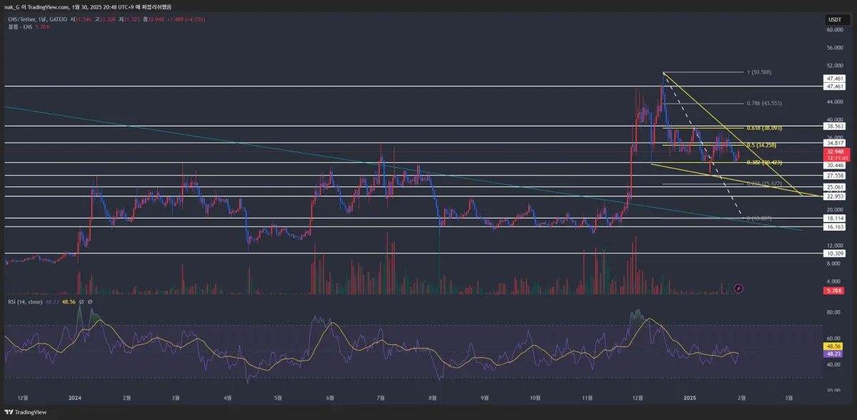 일봉의 추세선이었던 35.5 정도를 목표가로 잡고 피보나치 되돌림을 적용하였을 때 0.236구간을 손절라인으로 적용하였습니다.