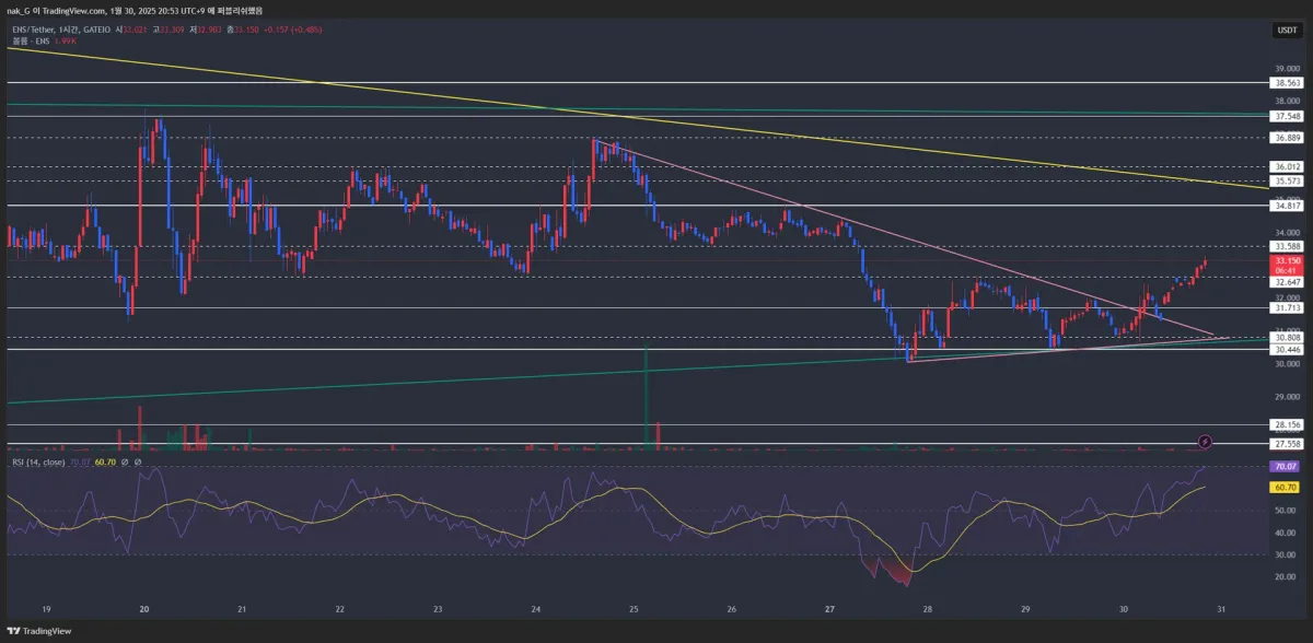 쐐기형패턴을 뚫고 점차 증가하는 추세가 확인되어 진입하였습니다.