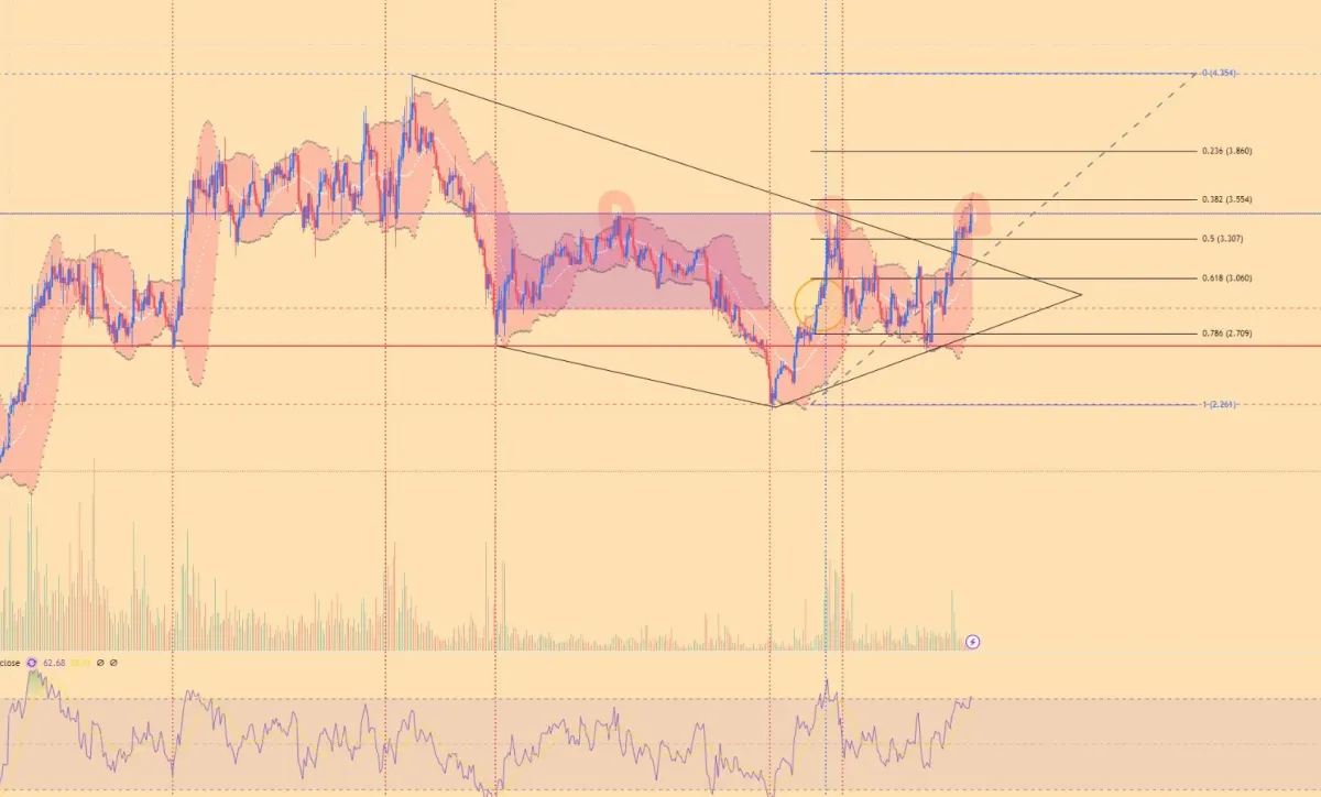 폴링 웻지 패턴에서 리테스트가 나오며 반등하여 전고점의 저항선을 터치했습니다.