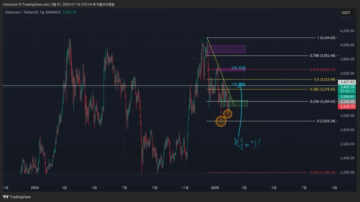 주황색 작은 동그라미 부분을 기준으로 잡으면 가로추세선과 피보나치 부분이 딱 맞아떨어져서 자꾸 두번째 동그라미를 기준으로 하고 싶은 마음이 가장 크지만! 어디까지나 이건 그러고 싶은 마음이기에...