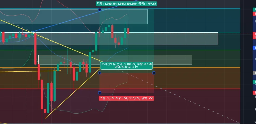 제일 하단 네모(매물대102k)돌파 후 롱 포지션 진입.