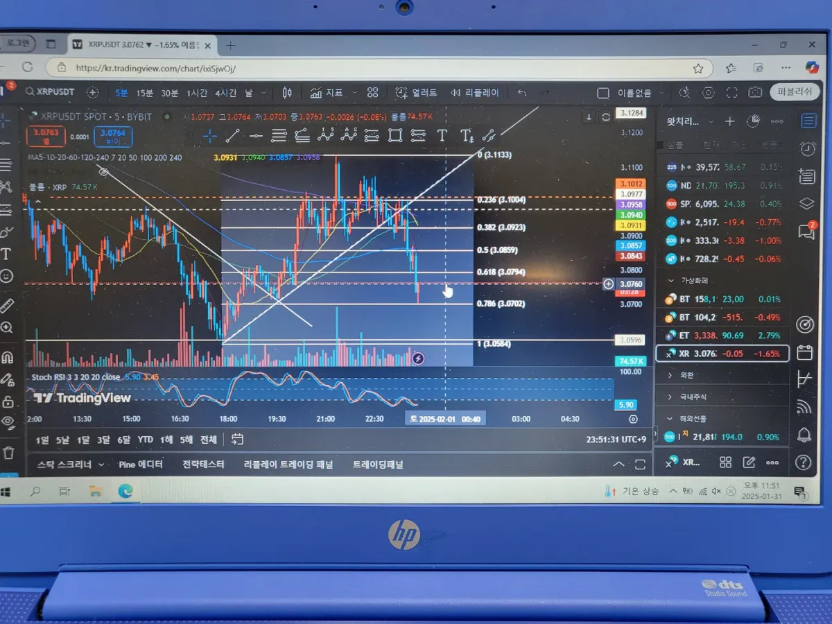리플 피보나치 차트 분석후 상승추세 뚫고 하락 확인후 숏 진입후 소액이지만 분할 익절하였습니다.