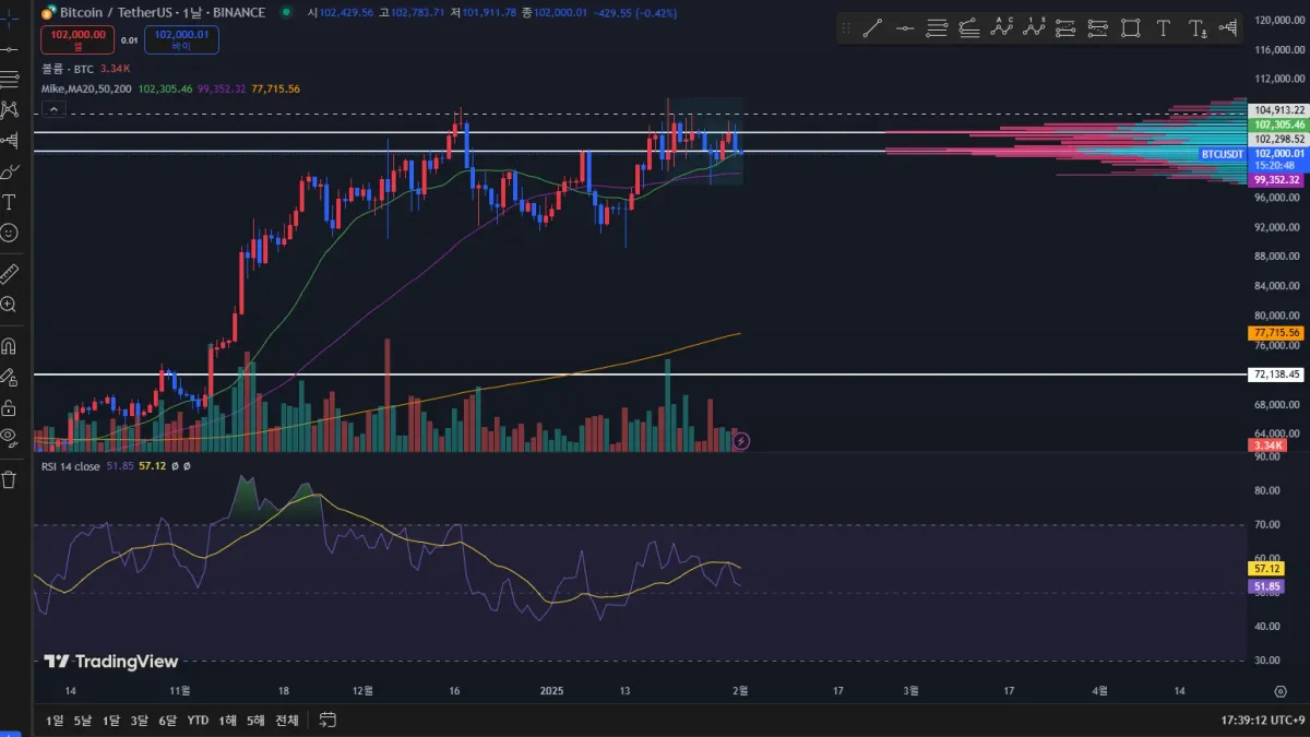 비트코인 차트에 이평선과 RSI 지표를 추가해 보았습니다.