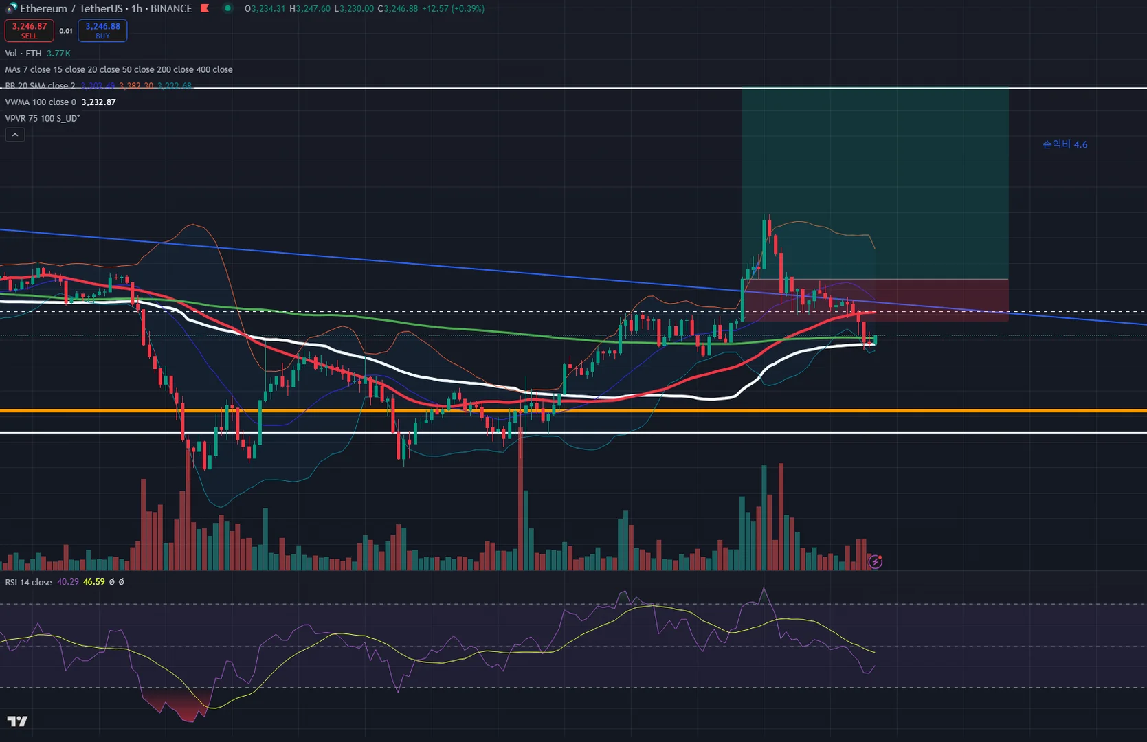 현재 1시간봉 기준 200일 선과 거래량가중100일 이평선에서 동시에 지지받는 모습을 보여주고 있으니 계속 관망하다 같은 방법으로 하락추세선 돌파 시 롱포지션에 진입할 계획입니다.