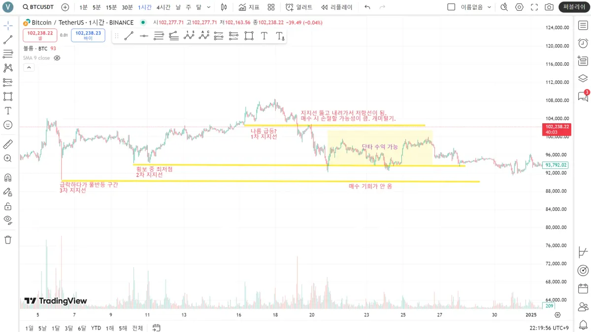 2) 지지, 저항, 추세선을 작도해보았습니다.