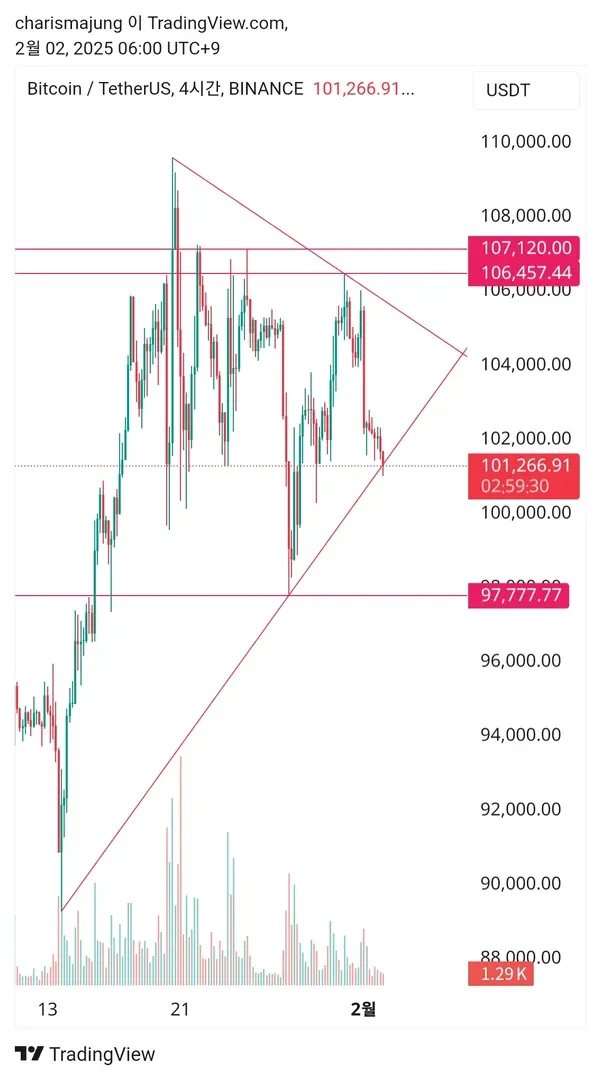 비트코인 4시간봉 최저점부분과 고점부분 추세선 작도와 지지저항 체크해보았습니다