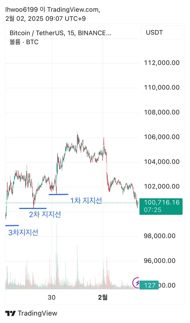 1차지지선에서 진입한경우 두번째리테스트구간에서 하락