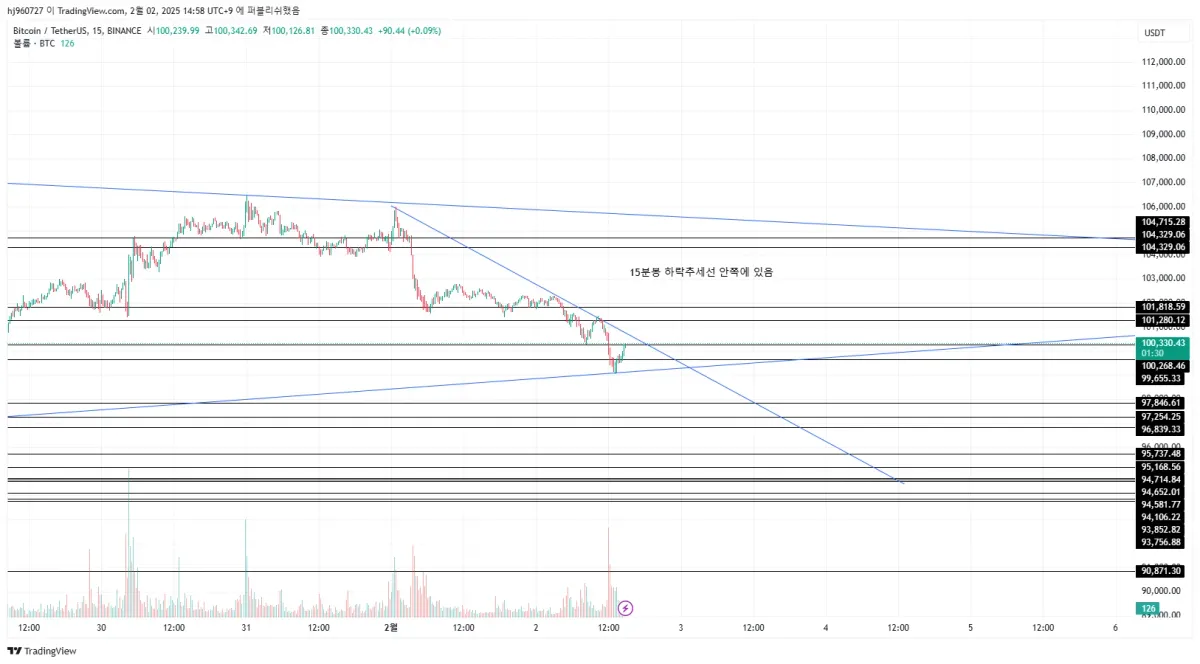 단기적으로 숏 포지션이 유리하다고 판단합니다 최소 100600까지는 올라와야 단기적인 하락추세선이 깨지는 걸로 보입니다.