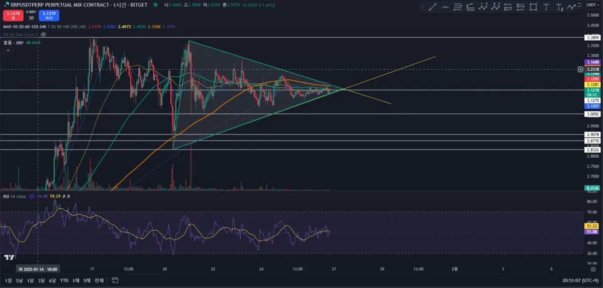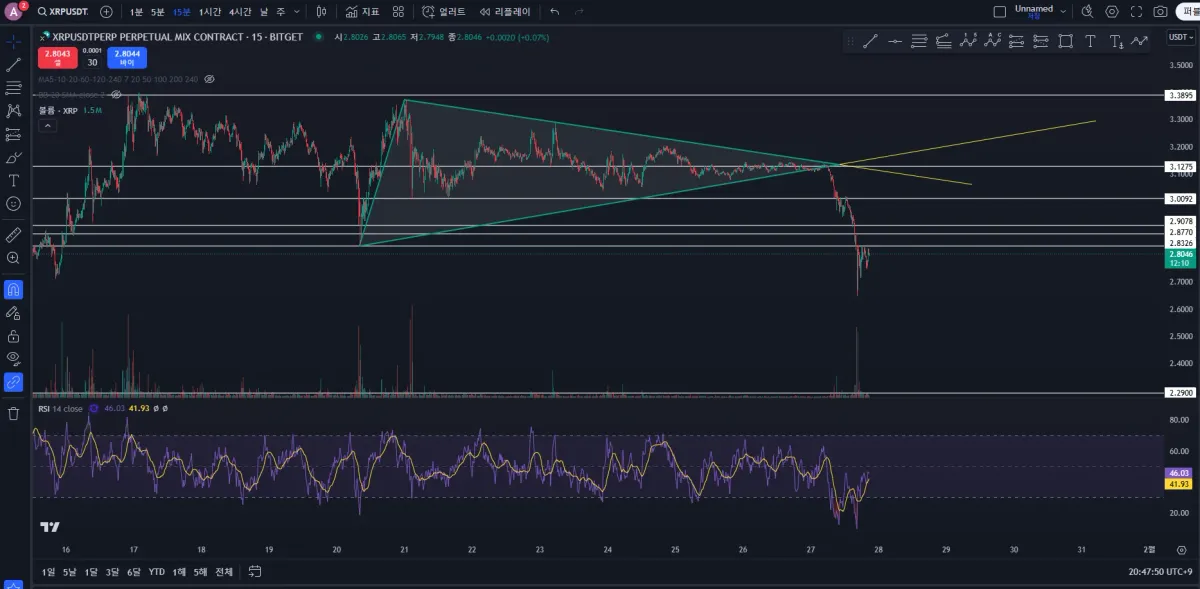 리플 삼각수렴패턴 이후 하방으로 뚫을지 상방으로 뚫을지 대기하며 기다리다가 하방으로 뚫는걸 확인하고 숏 모의 투자 진행하였습니다!
