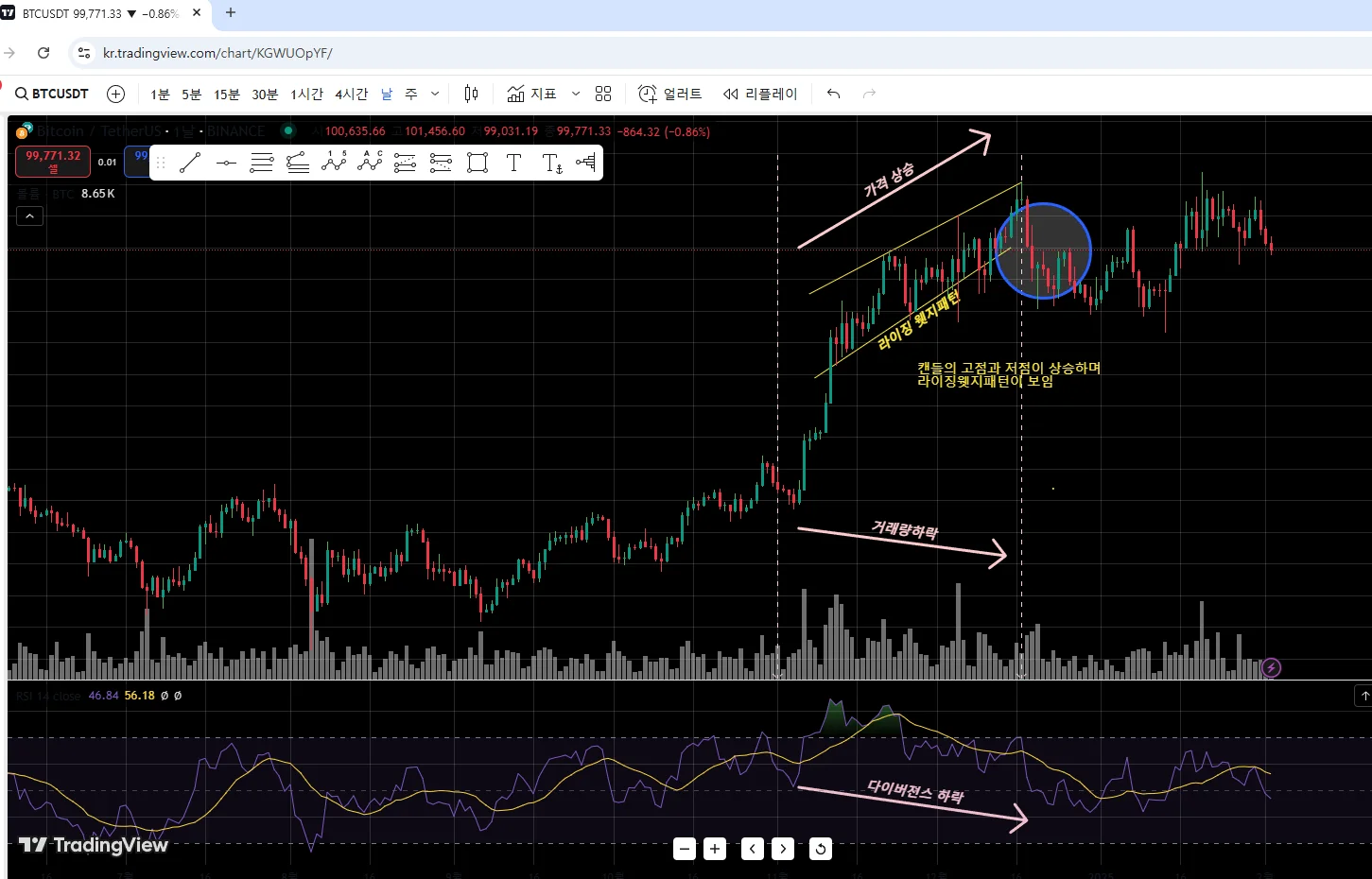 ㅁ가격은 상승하지만 + 다이버젼스가 하락하고 있다. = 상승 중 하락다이버젼스가 보이는 것은 추세 전환이 될 것을 암시