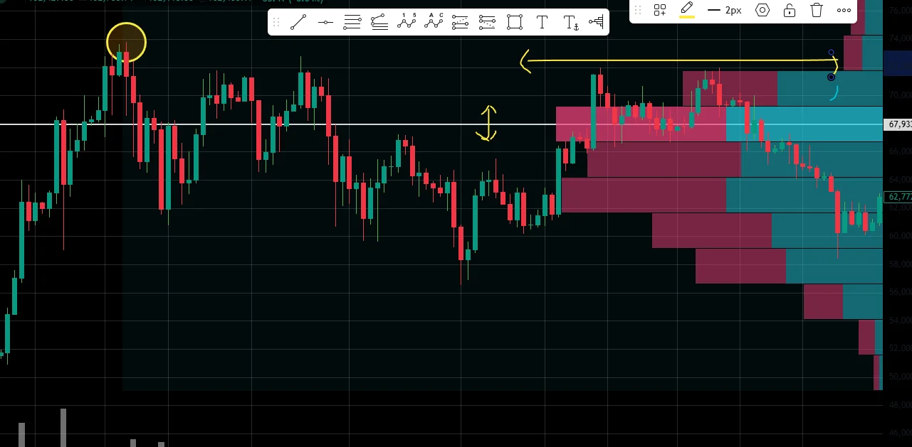 노란색 동그라미를 친 고점을 클릭 한 후 나온 고정볼륨 프로파일 값 입니다. 두꺼운 흰색 선으로 고정 매물대 값이 나온 다는 것 까지는 이해했습니다만
