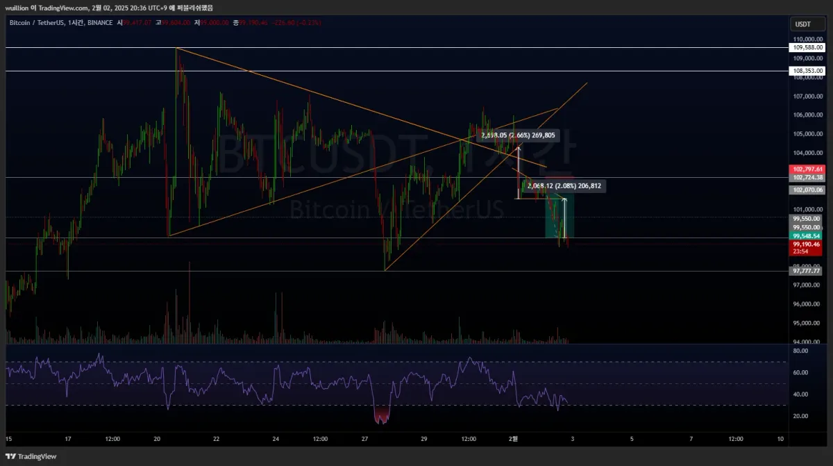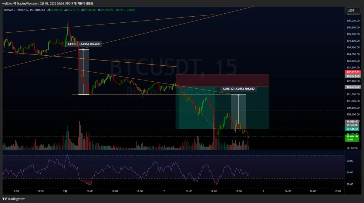 SL : 바로 아래 저항라인 99,600에서 50%익절 / 그 아래 저항라인 97,800에서 전량익절설정(포지션 보유중)