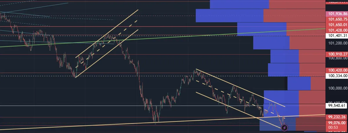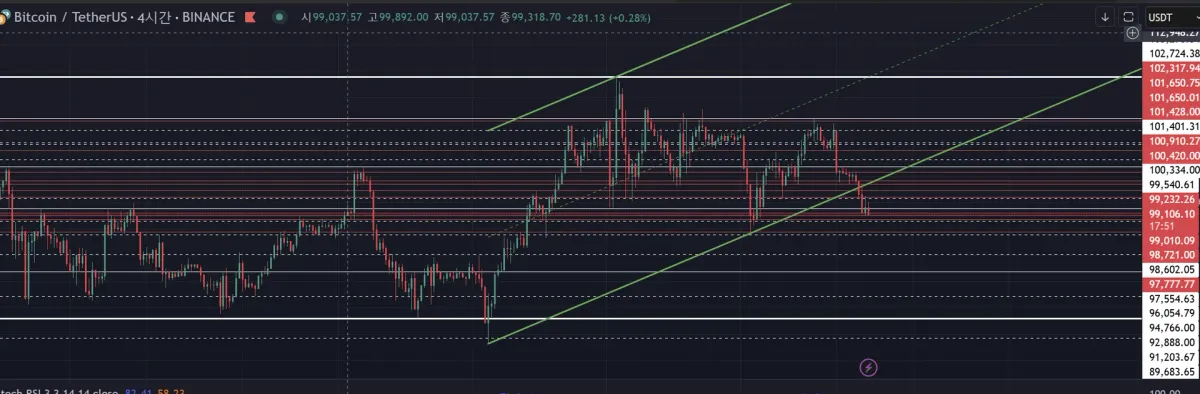 4시간봉 흰실선 99,540 지지에 익절을 걸어 놓았습니다.