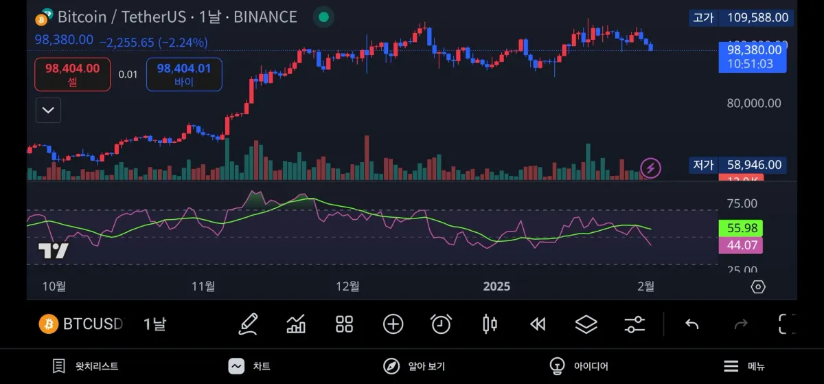 RSI가 44여서 추세를 조금 더 본 후에 30이하로 떨어지면 매수하는 게 좋을 것 같아요.