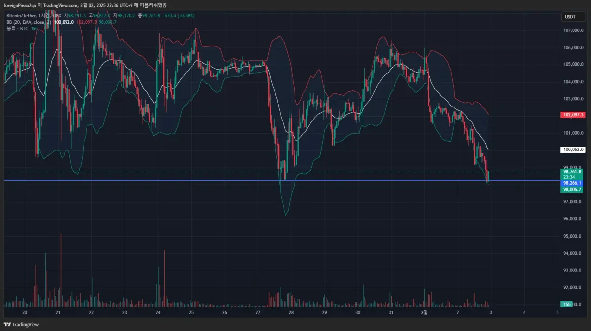 2/2 하루종일 하락 추세였으며 한시간 봉 기준 파란색선(지지선)이 강하게 지지하는 선의 역할을 하고 있는거 같으며 또 볼린저 밴드 아랫부분에 닿이기도 하여 롱으로 진입 해 보았습니다.