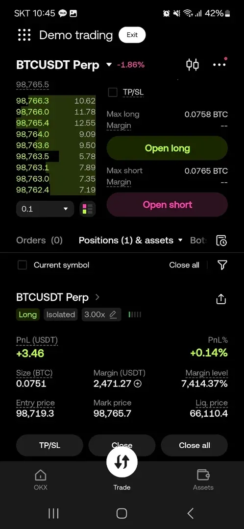 진입을 늦게 하여 수익률이 낮긴 하지만 진입 봉 기준 양봉이 더 나올 수 있을 거 같습니다. 제출할 시간에 조금 쫒기듯 진입은 하였지만 오늘 하루는 롱 보다는 숏 타점이 나왔을 때 진입을 하는 것이 확률이 더 높다고 생각합니다.