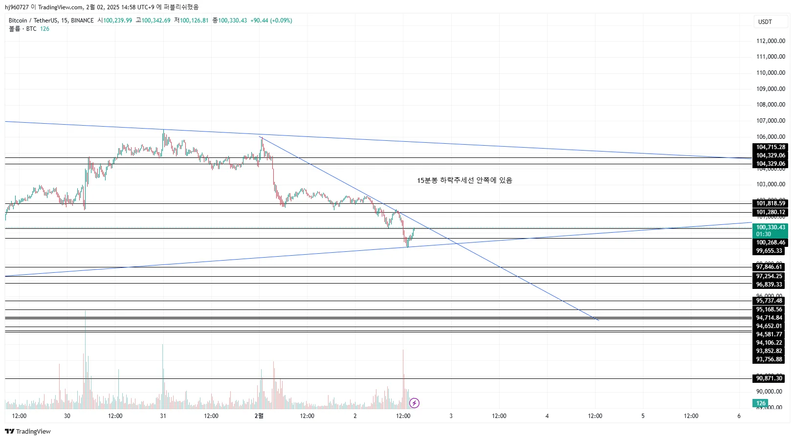 심리상태 추세지속으로인한 안정감, 15분봉상 하락추세 이탈 시 조금 마음이 편하지 않을 것 같음